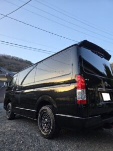 美しく黒光りするハイエースと素敵なカーライフをお楽しみくださいませ。